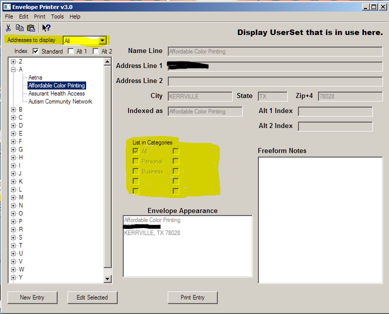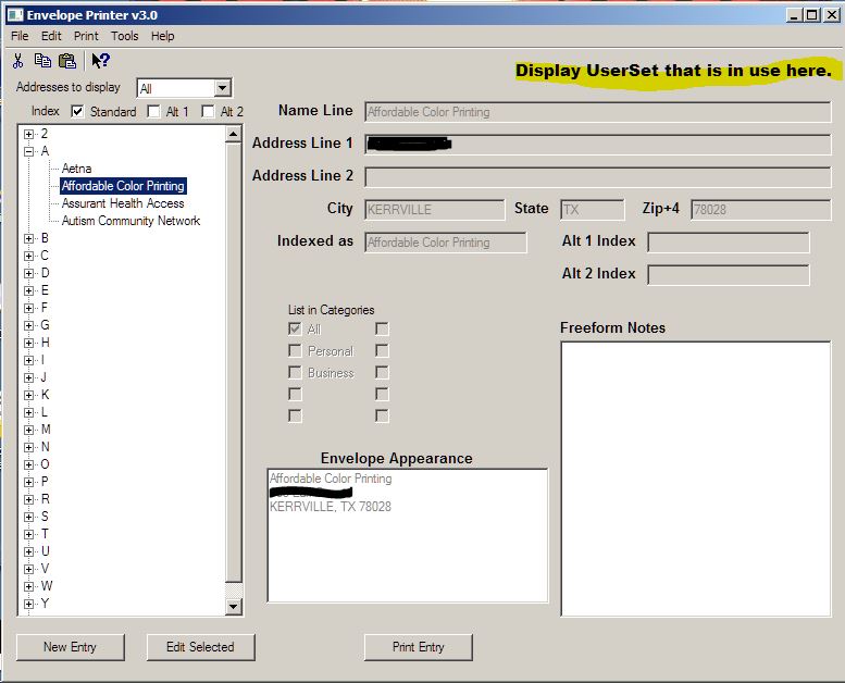 Again, the UserSet will include return address information, a bitmap/jpeg logo that will display/print to the left of the Return address, default font's to be used, default printer, envelope paper size, etc.  Each address in the address book will be associated to a UserSet.  Therefore, you could think of each UserSet as being it's own address book within the address book.  However, one address entered under one UserSet will not be available for printing under a different UserSet.  The address would have to be entered into each UserSet in order to be present in that UserSet's list of addresses.  I am thinking about providing an option that will allow the use of "independent" address books by UserSet to be turned on and off.  If turned off, then all addresses will be associated with all UserSets and the UserSet would not be used as another filtering mechanism.  If turned on, then the UserSet is just another filtering mechanism associating a specific return address to specific entries in the address book.